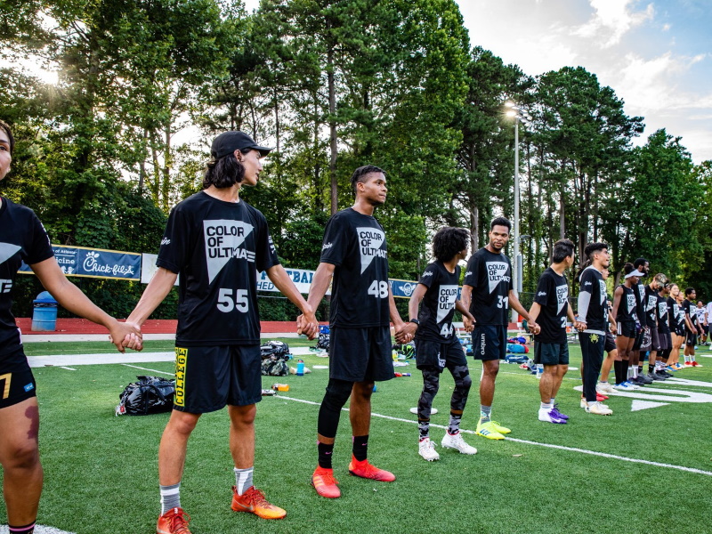 Since 2019, we have collaborated with Color of Ultimate, partnering to create opportunities for BIPOC players to build community at major USAU events and to showcase games featuring two teams of elite players of color designed to help raise awareness about the current racial and socioeconomic inequities in ultimate.
